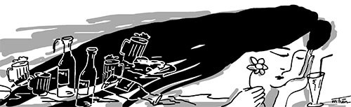 Hôm nay thật không may cho cô, bàn của cô lại gần bàn của mấy gã lôm côm. Họ nói chuyện ầm ào trong hơi men. Không ngó sang nhưng cô biết, mấy gã đang nhìn cô chằm chằm, như soi mói, cười cợt. Thoáng nghe qua cuộc đối thoại đã biết mấy gã chẳng tử tế gì. Cô ráo hoảnh ngoảnh hướng khác làm ngơ. Cố gắng không đụng chạm điều gì, cả kể một ánh nhìn.