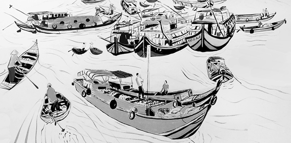 Ngày xưa của tôi là những lần thức dậy thật sớm ngồi bến sông đón ghe hàng từ vàm sông chạy vào. Má dặn tôi đón ghe hàng mua mắm muối, ông cũng bỏ mấy ngàn đồng mua phông thuốc gò để hút cho thơm miệng. Sợ ghe hàng đi mất, tôi ngồi dưới bến sông hái lá thả thuyền hay lấy que trêu đàn cá bạc đầu. Xóm tôi được bao bọc xung quanh bởi vườn tược, cánh đồng, chợ thì ở xa, năm hôm mười bữa mới có dịp đi chợ một lần cùng má. Bởi vậy mà chiếc ghe hàng trở thành cái tiệm tạp hóa di động, nhỏ thế thôi nhưng bán đủ mọi mặt hàng. Ghe hàng chưa đến mà tiếng còi đã vang động. Ở xóm tôi mỗi ngày ba lượt ghe hàng chạy qua, tôi còn nhớ rất rõ chiếc ghe hàng màu xanh nước biển của chú Ba Tăng, chiếc ghe hàng màu nâu của chị Đúng và chiếc ghe màu xanh lá mạ về xóm mỗi khi hoàng hôn chập choạng buông của dì Phăng-người phụ nữ thân hình gọn ghẽ, dáng đon đả, cái miệng lúc nào cũng “tía lia” làm vui lòng khách quê. Bọn trẻ chúng tôi thích nhất là khoảnh khắc cầm trên tay mấy tờ tiền má đưa đứng vẫy ghe hàng ghé lại rồi mua hàng. Khi mắm muối, khi hộp nhang muỗi, khi gói thuốc, rau củ chanh ớt ghe hàng cũng có bán, thuốc ho thuốc cảm đủ cả… người lấy thuốc không được học bài bản như kê toa có vẻ rất “mát tay”. Hồi bà tôi cảm, bà chống gậy xuống ghe hành kêu dì Phăng bán hai lần thuốc uống, vậy mà uống xong hai lần thì bà tôi khỏi hẳn. Bà nói: “Tao uống thuốc dưới ghe hàng vẫn mạnh phà phà, có cần đi bệnh viện, đi trạm xá gì đâu?”. Còn tôi, khoái chí nhất vẫn là lúc mua đồ dư mấy ngàn đồng. Mớ kẹo bòn bon xanh đỏ, gói bim bim, chai nước ngọt đủ màu… không nằm ngoài tầm ngắm của tôi.