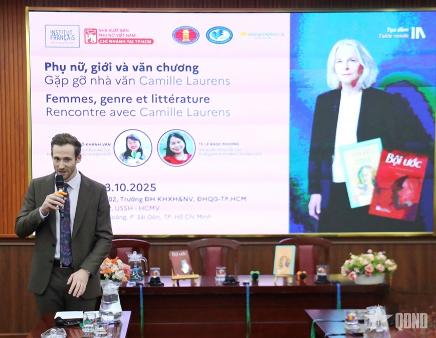 Tại tọa đàm, nhà văn Camille Laurens chia sẻ hành trình sáng tác, quan niệm nghệ thuật và những chủ đề quen thuộc trong các tác phẩm của mình: Tình yêu, đời sống xã hội và nữ quyền.
