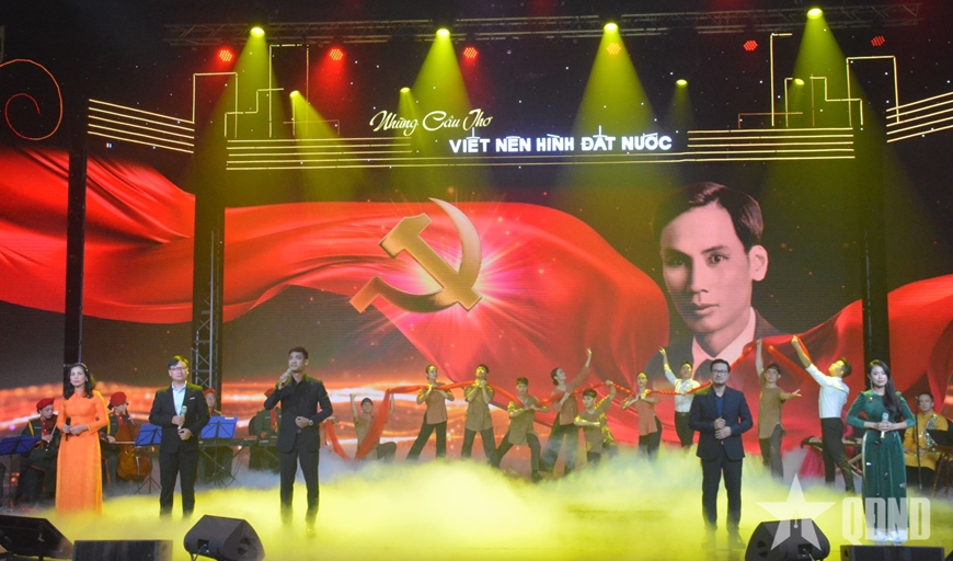 | Các nghệ sĩ thể hiện bài thơ "Người đi tìm hình của nước" của nhà thơ Chế Lan Viên trong đêm thơ "Những câu thơ viết nên hình đất nước", tháng 8-2025. Ảnh: THÀNH DUY |