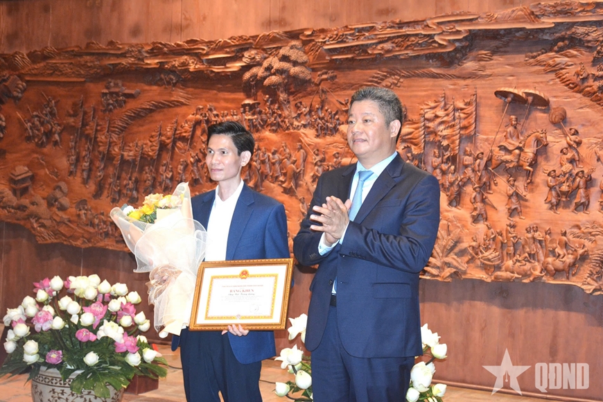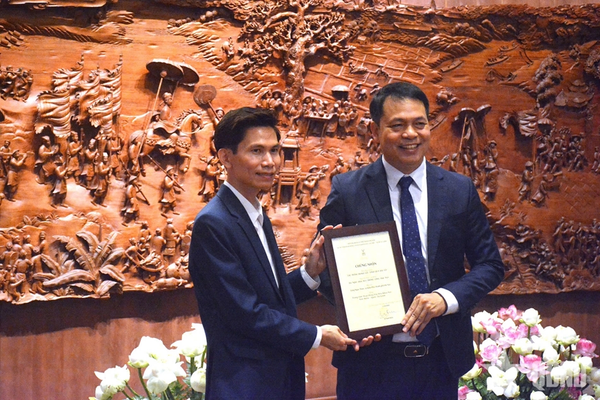 Trao chứng nhận tác phẩm tranh gỗ "Vinh quy bái tổ". |