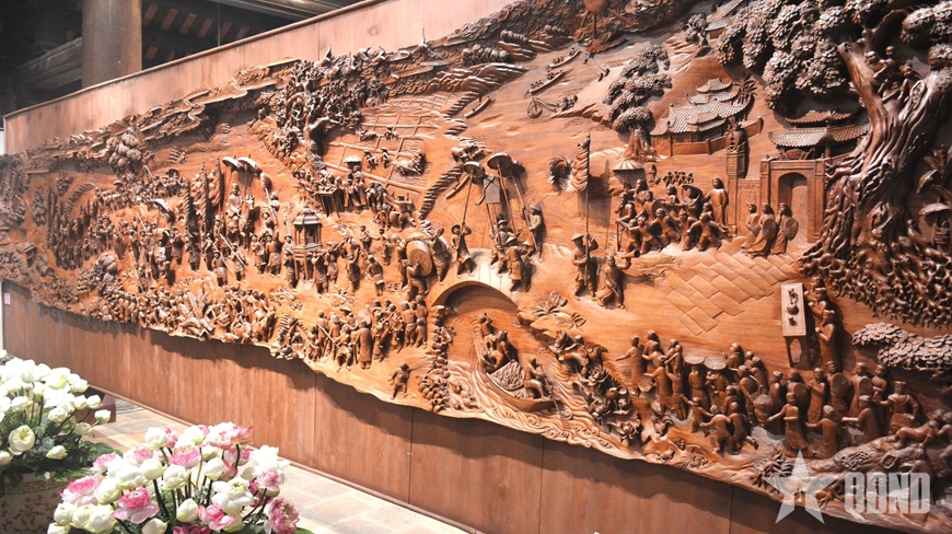 Tác phẩm “Vinh quy bái tổ” được chế tác từ gỗ cẩm quý hiếm, với kích thước dài 8m33, rộng 1m70, dày 16cm. Bức tranh tái hiện sinh động hành trình khoa bảng từ thuở nhỏ học với thầy đồ, đến lều chõng đi thi Hương rồi trẩy kinh thi Hội, thi Đình, đề tên Bảng vàng và được vua ban Ân Tứ trở về làng trong Lễ Vinh quy.