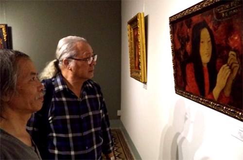 Họa sĩ Lương Xuân Đoàn (bên trái) tại triển lãm “Những bức tranh từ châu Âu về”. Ảnh: THÙY ÂN