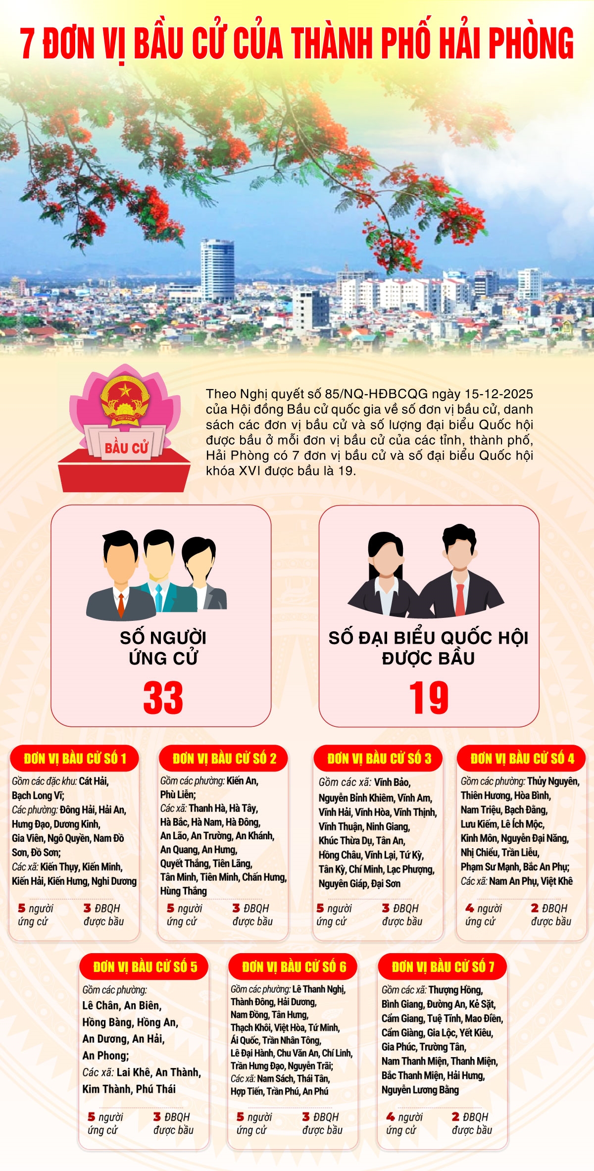 Theo Nghị quyết số 85/NQ-HĐBCQG ngày 15-12-2025 của Hội đồng Bầu cử quốc gia về số đơn vị bầu cử, danh sách các đơn vị bầu cử và số lượng đại biểu Quốc hội được bầu ở mỗi đơn vị bầu cử của các tỉnh, thành phố, Hải Phòng có 7 đơn vị bầu cử và số đại biểu Quốc hội khóa XVI được bầu là 19.