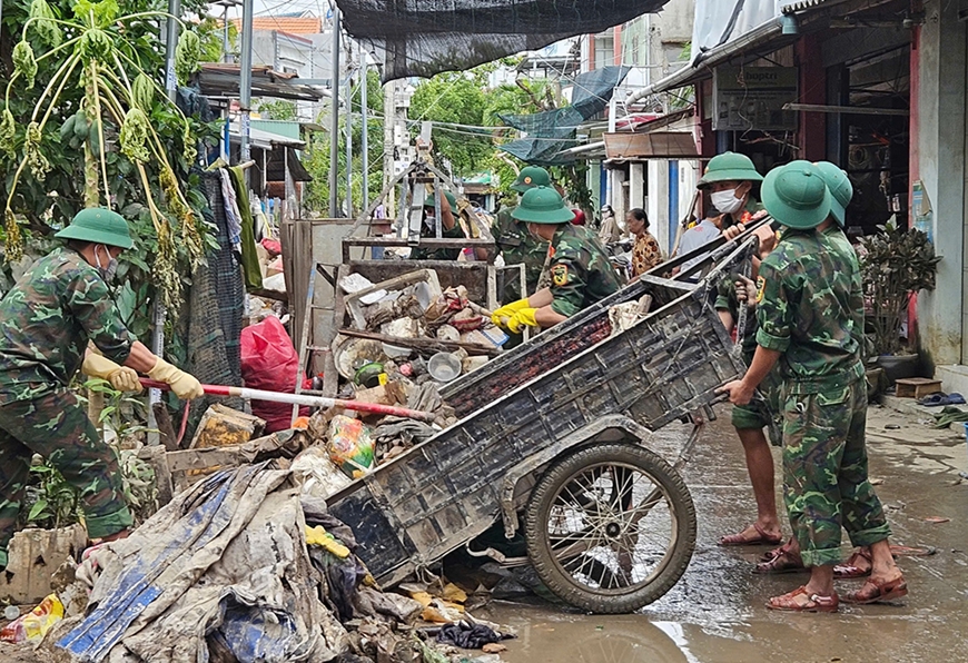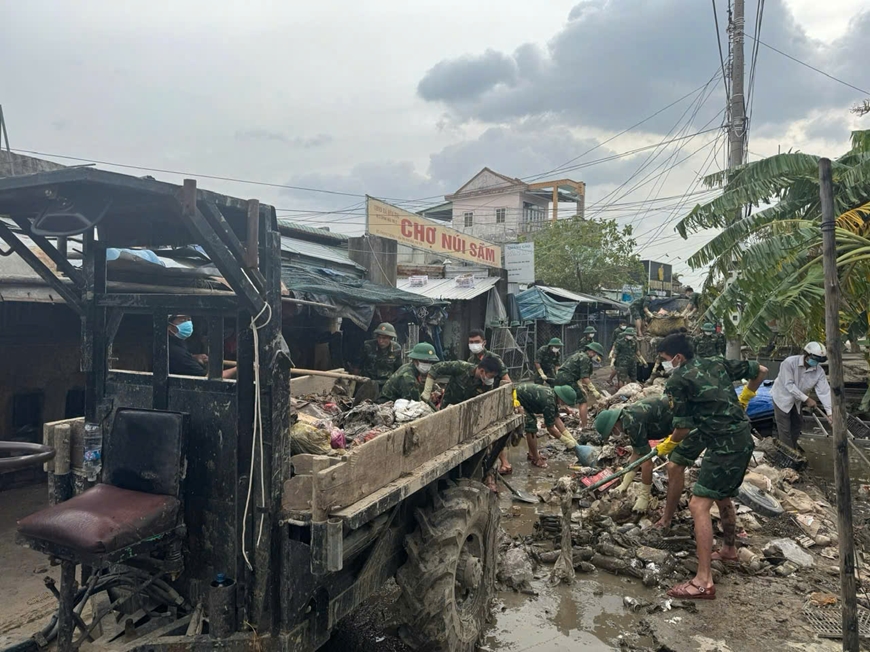 | Cán bộ, chiến sĩ Lữ đoàn Đặc công bộ 198 thu dọn bùn đất, khắc phục hậu quả mưa lũ tại chợ Núi Sầm. |