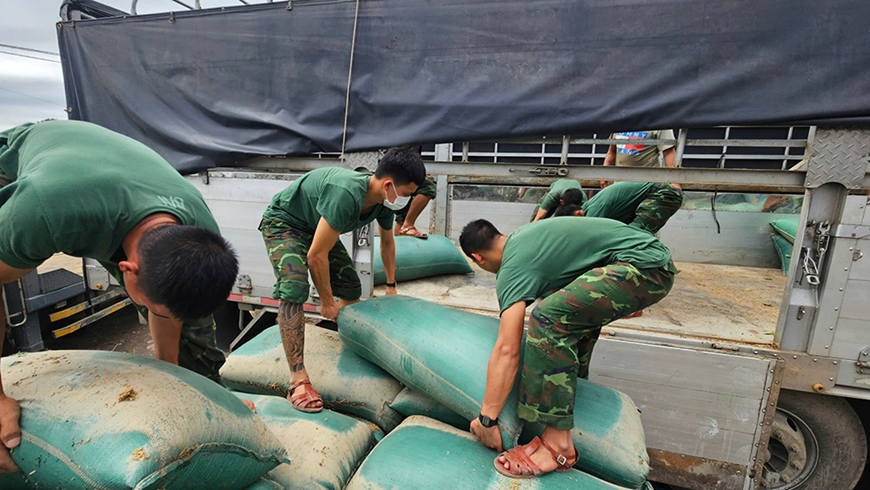 Bộ đội Lữ đoàn Đặc công bộ 198 hỗ trợ người dân xã Tây Hòa bốc xếp, vận chuyển thóc, gạo ẩm đi phơi.