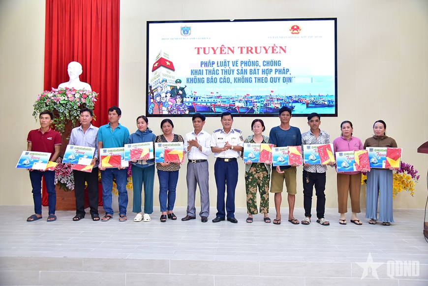 Cán bộ Vùng Cảnh sát biển 4 phối hợp cùng các lực lượng tuyên truyền pháp luật chống khai thác IUU cho bà con ngư dân.