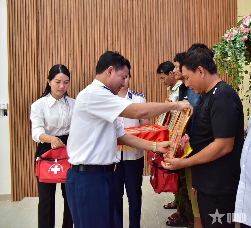 | Đại tá Nguyễn Thái Dương, Phó chính ủy Bộ tư lệnh Vùng Cảnh sát biển 4 trao quà, ảnh Bác Hồ, cờ Tổ quốc và túi thuốc y tế tặng bà con ngư dân. |