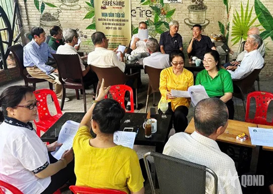 Cử tri phường Bình Thạnh tham gia chương trình “Cà phê sáng đại đoàn kết” trao đổi về bầu cử.