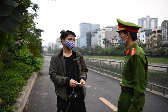 Lực lượng chức năng nhắc nhở người dân tại tuyến đường đi bộ ven sông Tô Lịch (quận Cầu Giấy, TP Hà Nội) trong thời gian cách ly xã hội. Ảnh: KHÁNH HUY |