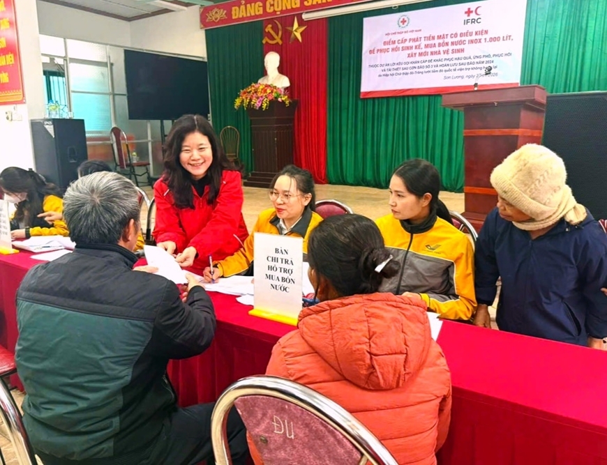| Hội Chữ thập đỏ tỉnh Phú Thọ cấp phát tiền mặt hỗ trợ người dân mua bồn chứa nước. Ảnh: Hội Chữ thập đỏ tỉnh Phú Thọ cung cấp |