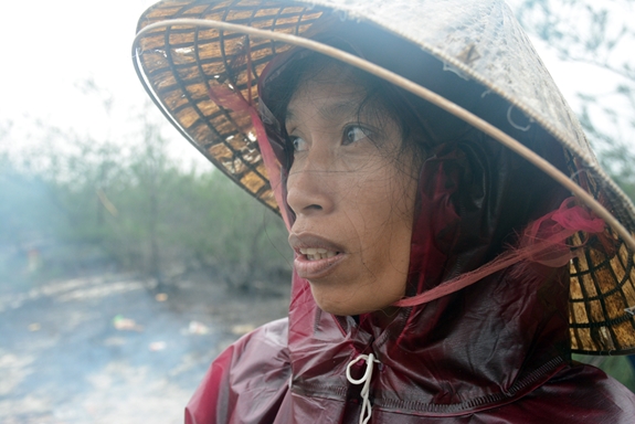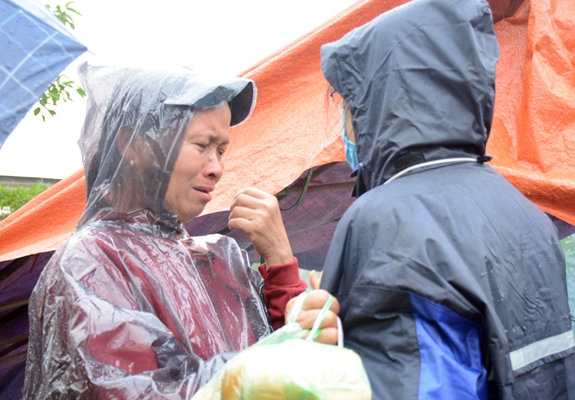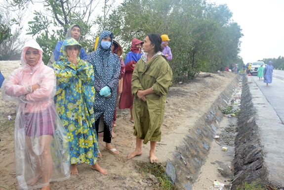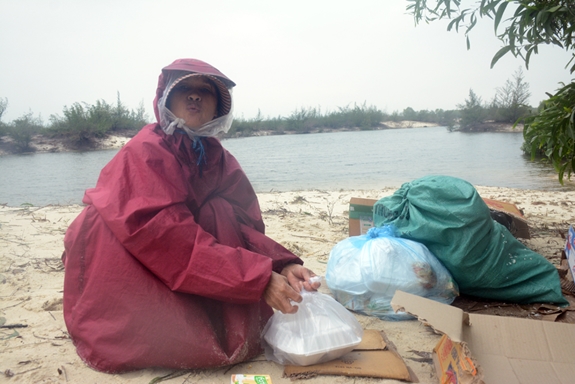 Ngồi co ro trên đụn cát, nước da tái đi vì lạnh, cô Phạm Thị Miện, xã Hồng Thủy, huyện Lệ Thủy, tỉnh Quảng Bình lấy thêm chiếc túi nilon đội vào đầu, cố ngồi đợi cho có đủ suất cơm mang về chia cho người già, trẻ em đang tránh trú trong trường học.