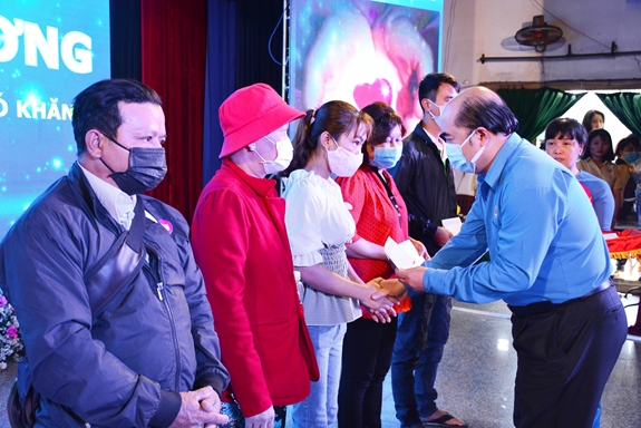 | LĐLĐ TP Hồ Chí Minh trao quà Tết tặng NLĐ bị bệnh hiểm nghèo. |