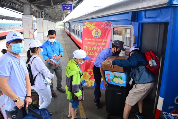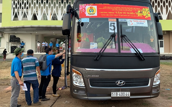 | Chương trình "Tấm vé nghĩa tình" của Công đoàn Khu công nghiệp - Khu chế xuất TP Hồ Chí Minh thực hiện đưa NLĐ về quê. |