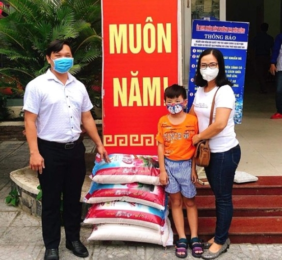 Cháu Huỳnh Nguyễn Minh Khang cùng mẹ trao 100kg gạo tới đại diện lãnh đạo phường Nại Hiên Đông để ủng hộ người nghèo gặp khó khăn trên địa bàn phường do dịch Covid-19.