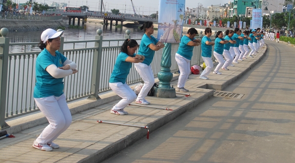 Người dân tập thể dục trên bờ kênh Tân Hóa - Lò Gốm. |