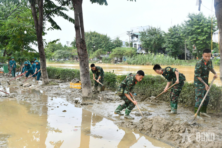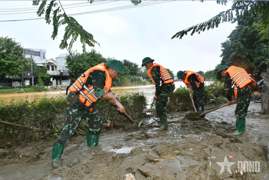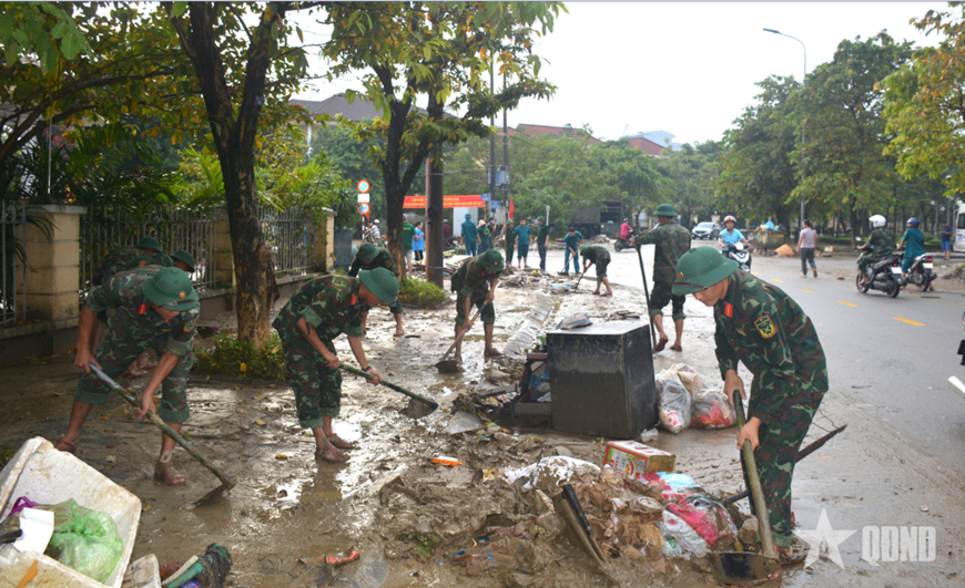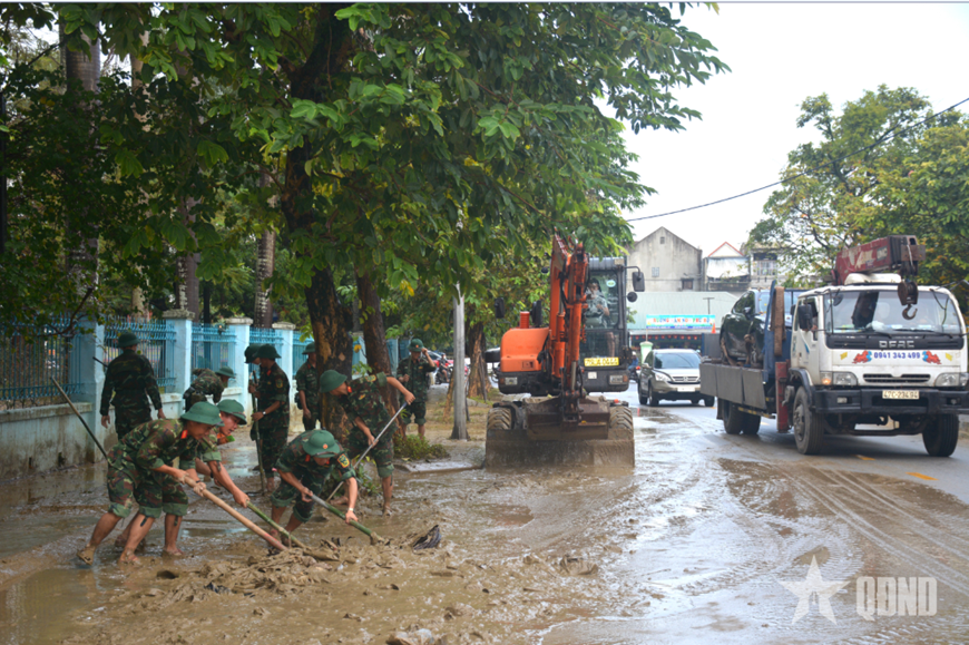 Từ sáng sớm 1-11, theo chỉ đạo của Bộ CHQS TP Huế, hơn 80 cán bộ, chiến sĩ Trung đoàn 6 trực tiếp hỗ trợ nhân dân tổng dọn vệ sinh, bảo đảm thông tuyến cho người, phương tiện đi lại. Đại úy Mai Cao Nguyên, Phó tiểu đoàn trưởng Tiểu đoàn 1, Trung đoàn 6 trực tiếp cùng bộ đội thu dọn bùn đất. Các chiến sĩ đều hối hả bắt nhịp công việc theo người chỉ huy. UBND phường An Cựu điều động thêm 50 cán bộ, chiến sĩ dân quân, cùng lực lượng của Trung đoàn 6 khẩn trương dọn dẹp tuyến đường.