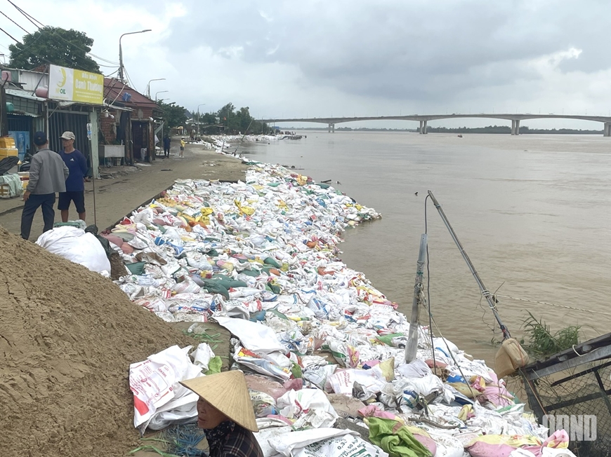 | Với sự chung tay của các lực lượng và người dân, bờ kè thôn An Lương, xã Duy Nghĩa được gia cố tạm thời. |