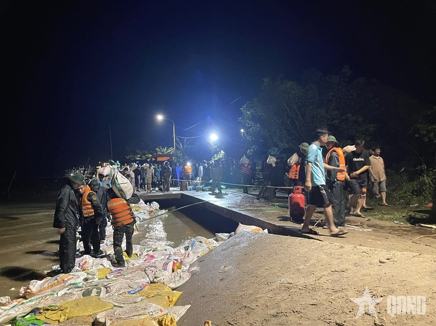 | Các lực lượng làm nhiệm vụ xuyên đêm, chung tay cùng người dân gia cố tạm thời bờ kè An Lương, xã Duy Nghĩa. |