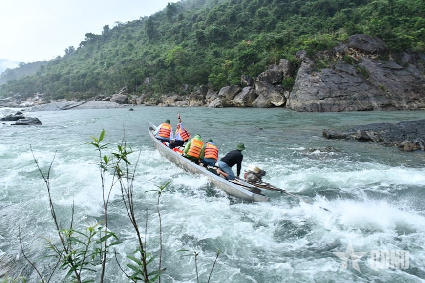 | Đoàn công tác UBND xã Trường Sơn vượt thác Tam Lu vào các bản Hôi Rấy, Nước Đắng. |