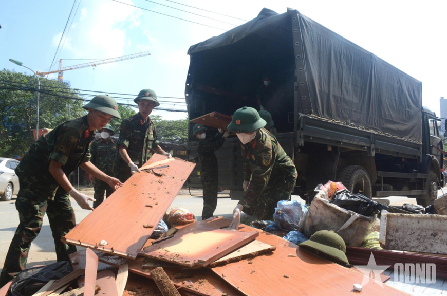 Chung tay cùng người dân, 700 cán bộ, chiến sĩ Trung đoàn 209, Sư đoàn 312 (Quân đoàn 12) tỏa đi khắp các tuyến phố ở phường Gia Sàng và phường Phan Đình Phùng giúp dọn bùn, thu gom rác thải, vệ sinh đường phố, trường học, công sở. Bộ đội làm việc từ 6 giờ đến hơn 11 giờ, ăn cơm vội vàng và tranh thủ chợp mắt ngay trên sàn Nhà văn hóa tổ dân phố 15, phường Phan Đình Phùng, đến 13 giờ 15 phút lại tiếp tục công việc. “Chia lửa” cùng lực lượng dọn vệ sinh môi trường địa phương, Trung đoàn Vận tải 651, Cục Hậu cần-Kỹ thuật Quân khu 1 điều động thêm xe tải giúp thu gom, vận chuyển rác. Nhờ thế, đến chiều 10-10, đường phố sạch hơn và lượng rác đã giảm nhiều...