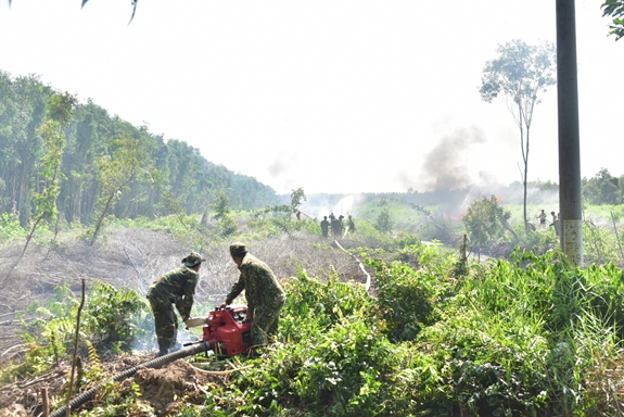 Cán bộ, chiến sĩ Bộ CHQS Cà Mau tham gia chữa cháy rừng. Ảnh: THÚY AN