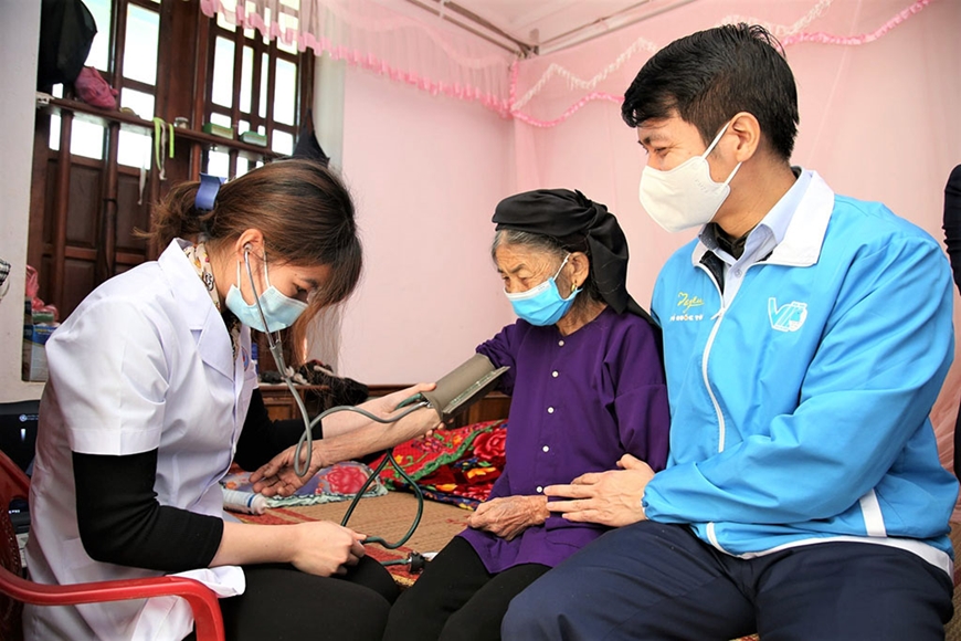 | Bác sĩ trẻ tình nguyện đến thăm, khám bệnh miễn phí cho đối tượng chính sách. |