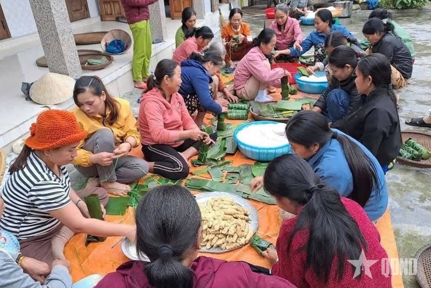 Tại Tổ dân phố Lại Bằng 2, phường Kim Trà, hàng chục chị em gói từng chiếc bánh chưng, bánh tét, bánh tày và các loại bánh Huế. Bên những bếp lửa hồng đỏ rực ngày đêm, hàng ngàn chiếc bánh các loại lần lượt được nấu chín, được chị em đóng gói cẩn thận, gửi vào cho bà con vùng lũ.