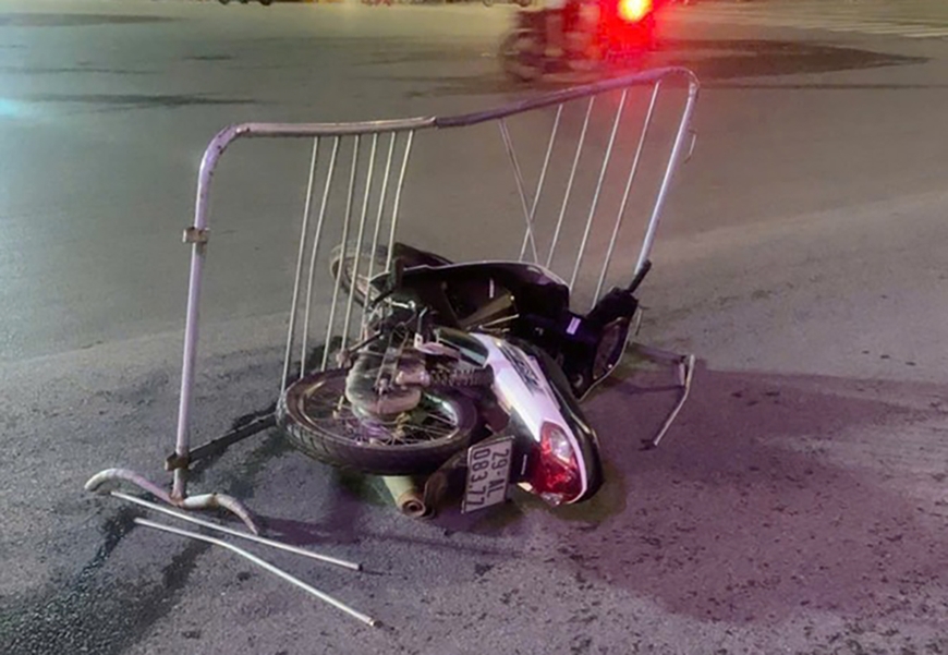 Xe máy của hai nghi phạm tông méo cả rào chắn đường. Ảnh: Minh Tú |