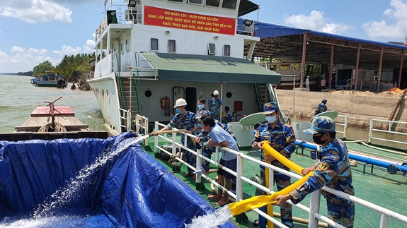 Khi dịch bệnh Covid-19 đã trở thành đại dịch trên toàn thế giới, các chiến sĩ Hải quân ngoài việc hỗ trợ nước ngọt và các dụng cụ chứa nước, tại các điểm cấp phát nước ngọt đã kịp thời tuyên truyền cho nhân dân vùng hạn mặn bằng nhiều hình thức như: Tặng khẩu trang kháng khuẩn, phát tờ rơi và tuyên truyền trên hệ thống loa phát thanh của các tàu để bà con đến nhận nước hiểu và yên tâm thực hiện công tác phòng dịch.
