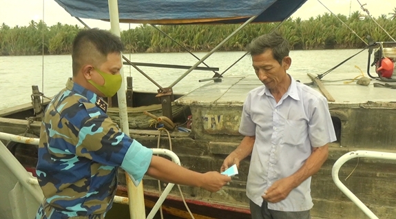 Chỉ huy Tàu 937 phát miễn phí khẩu trang kháng khuẩn và tuyên truyền cách phòng, chống dịch Covid-19 cho nhân dân. |