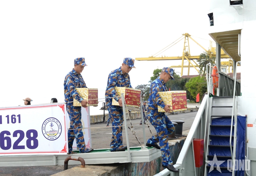 | Cán bộ, chiến sĩ Vùng 3 Hải quân chuyển hàng và quà Tết lên Tàu 628 (Hải đội 311, Lữ đoàn 161, Vùng 3 Hải quân). |