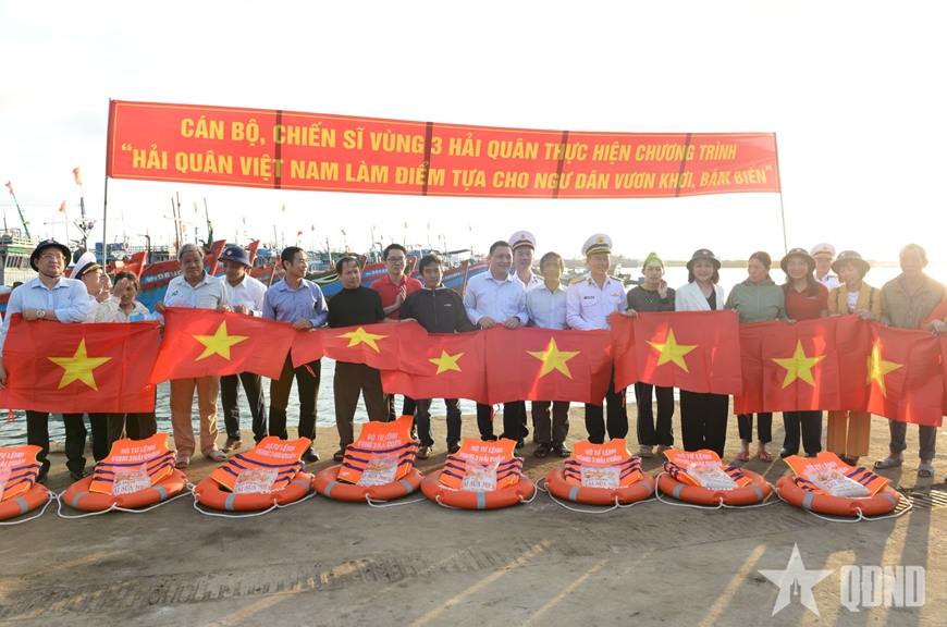 | Lãnh đạo Vùng 3 Hải quân và đoàn công tác tặng quà, cờ Tổ quốc cho ngư dân trên đặc khu Lý Sơn. |
