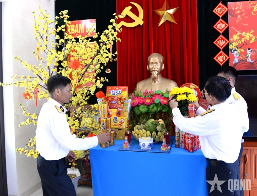 Cán bộ, nhân viên Trạm Radar 550 (Trung đoàn 351, Vùng 3 Hải quân) trang trí bàn thờ Tổ quốc đón Tết.