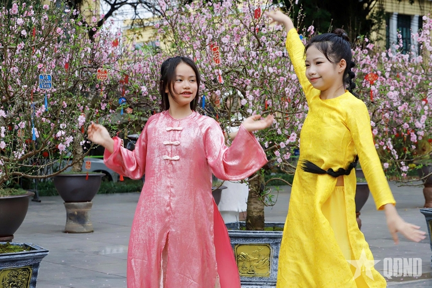 Dọc các tuyến đường trung tâm, sắc xuân hiện lên vừa rực rỡ vừa nền nã, cành đào, chậu quất trước hiên nhà; vài tốp người mặc áo dài tranh thủ ghi lại khoảnh khắc đầu năm; người già đi bộ chậm rãi, tay cầm cành lộc, gương mặt thư thái như giữ riêng cho mình một niềm vui giản dị.