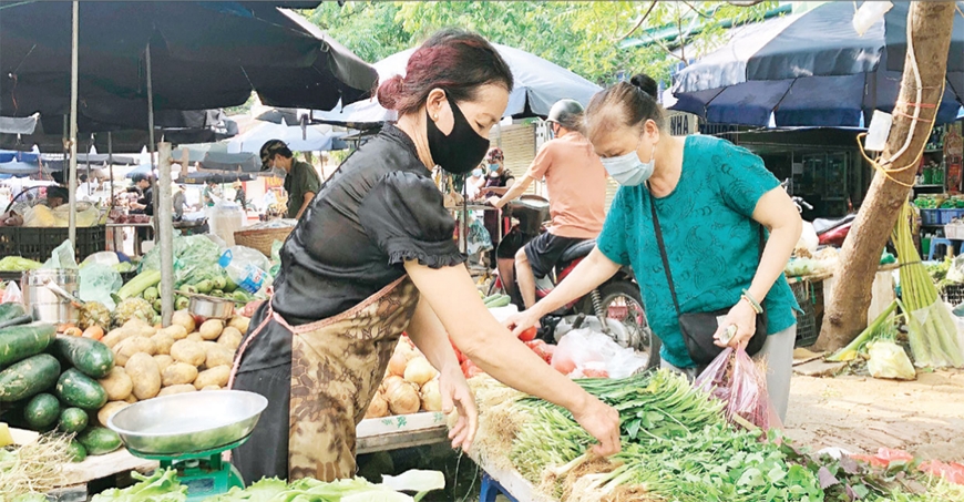 Người dân đi mua thực phẩm tại chợ Ngọc Thụy (phường Ngọc Thụy, quận Long Biên, TP Hà Nội). Ảnh: VIỆT TRUNG