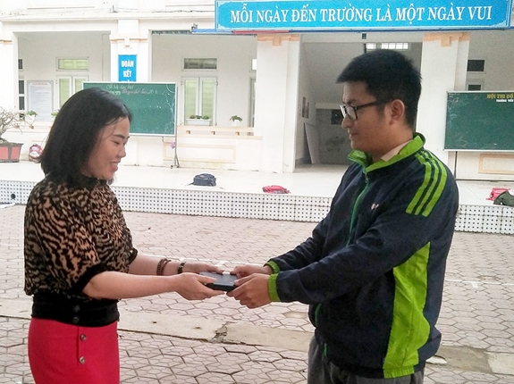 Cô giáo Nguyễn Thị Huệ trao lại tài sản cho anh Nguyễn Minh Vương. |