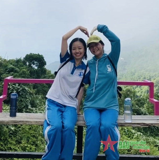 | Trang Trịnh (bên trái) cùng bạn tại đỉnh Đèo Hải Vân. |