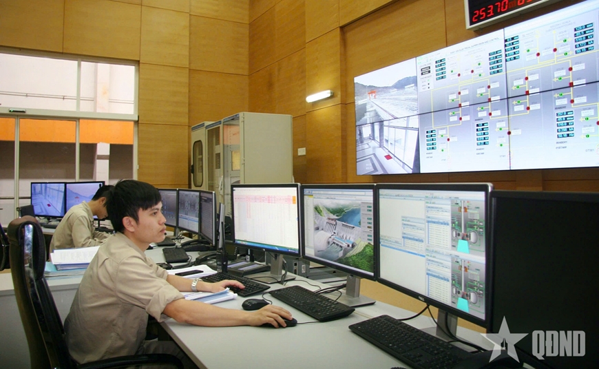 Các kỹ sư vận hành Nhà máy Thủy điện Lai Châu qua hệ thống điều khiển.