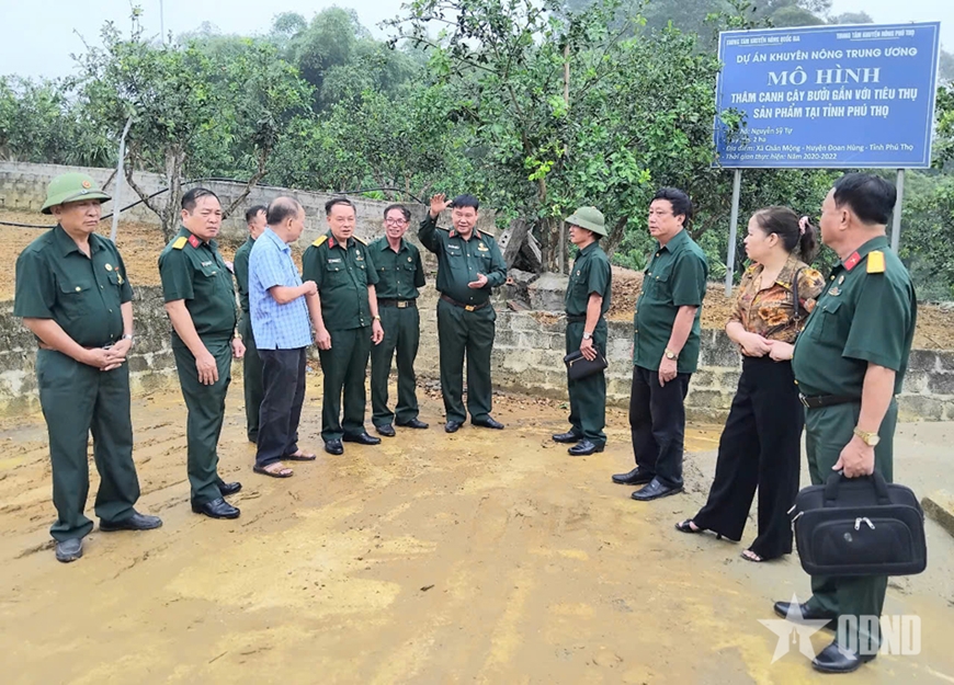 | Hội CCB tỉnh Phú Thọ tham quan mô hình hình thâm canh cây bưởi gắn với tiêu thụ sản phẩm của CCB Nguyễn Sỹ Tự, xã Chân Mộng. |