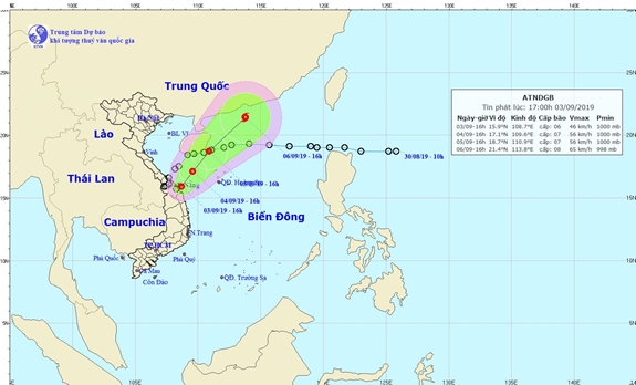 Theo Trung tâm Dự báo Khí tượng Thủy văn quốc gia, hồi 16 giờ ngày 3-9, vị trí tâm ATNĐ (có tên quốc tế KAJIKI) ở khoảng 15,9 độ Vĩ Bắc; 108,7 độ Kinh Đông, trên vùng biển các tỉnh từ Thừa Thiên-Huế đến Quảng Nam. Sức gió mạnh nhất vùng gần tâm ATNĐ mạnh cấp 6 (40-50km/giờ), giật cấp 8. Bán kính gió mạnh cấp 6, giật cấp 8 khoảng 60km tính từ tâm ATNĐ.