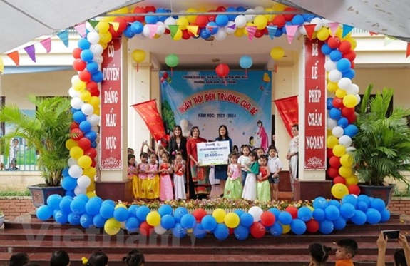 Đại diện Vinamilk trao tặng 21.600 hộp sữa Vinamilk ADM đến các em học sinh tại Trường Mầm non Cao Thành vào lễ khai giảng năm học mới.