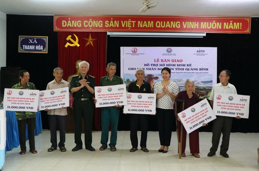 | Bà Nguyễn Thị Thanh Hồng và cán bộ Hội Hỗ trợ khắc phục hậu quả bom mìn Việt Nam trao hỗ trợ sinh kế cho nạn nhân bom mìn ở xã Thanh Hóa, Quảng Bình năm 2023. Ảnh do AEPD cung cấp |