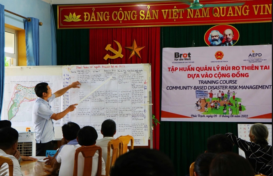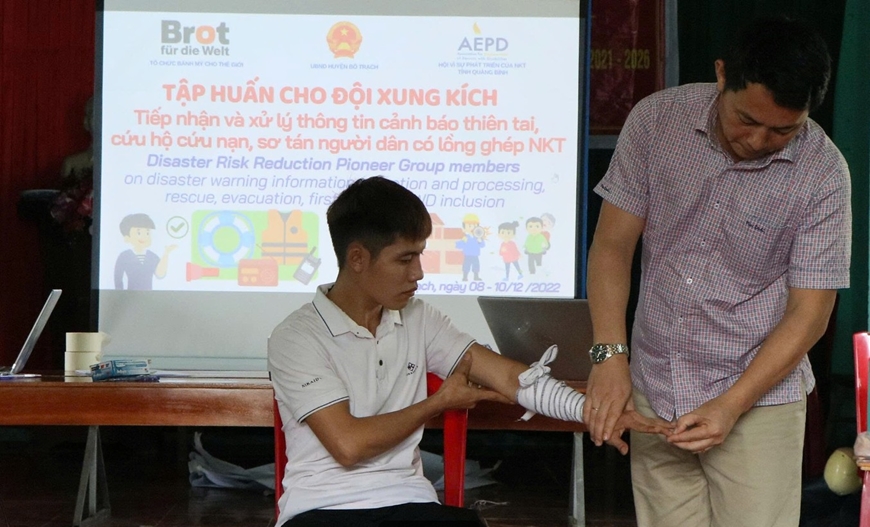 AEPD tham gia vào các hoạt động như tập huấn Quản lý rủi ro thiên tai dựa vào cộng đồng, tập huấn cho đội xung kích về tiếp nhận, xử lý thông tin cảnh báo thiên tai, cứu hộ cứu nạn và sơ tán có lồng ghép yếu tố khuyết tật; diễn tập về cứu hộ cứu nạn. Ảnh: AEPD cung cấp