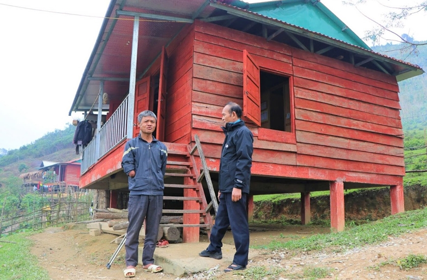 Nhân viên thực địa của Hội, ông Trương Minh Học, thăm nạn nhân Hồ Đon sau khi được hỗ trợ dựng nhà và hướng dẫn làm nghề mây tre đan. Ảnh: AEPD cung cấp