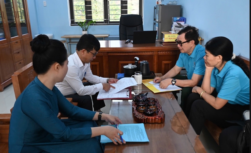 | Bà Nguyễn Thị Thanh Hồng (ngoài cùng bên phải) và cán bộ Hội Hỗ trợ khắc phục hậu quả bom mìn Việt Nam trao đổi công việc với lãnh đạo Trường THCS Liên Trạch, xã Bắc Trạch, Quảng Trị chuẩn bị cho chương trình tuyên truyền phòng tránh bom mìn, tháng 4-2026. |