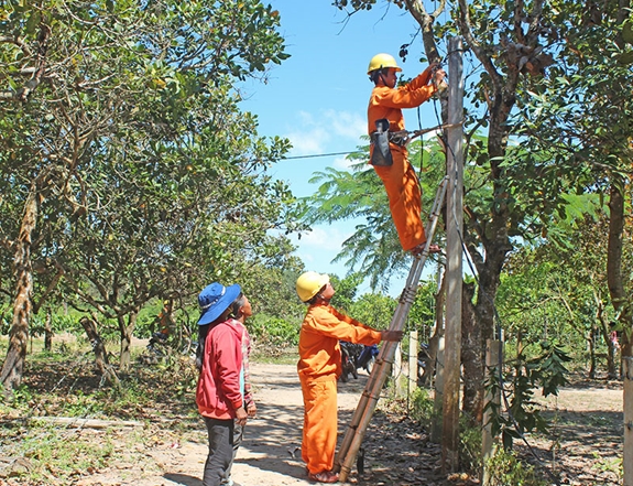 Công nhân PC Gia Lai lắp điện cho người dân làng Pờ Yầu. |