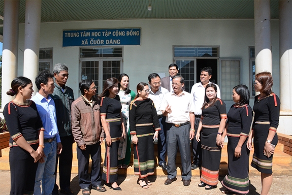 Cán bộ, đảng viên xã Cuôr Dăng, huyện Cư M’Gar trao đổi về nhiệm vụ phát triển kinh tế-xã hội của địa phương.