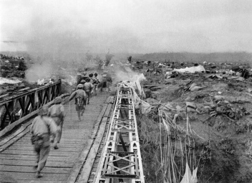 Bộ đội ta vượt qua cầu Mường Thanh, tấn công vào khu trung tâm Tập đoàn cứ điểm Điện Biên Phủ. Ảnh: TTXVN.