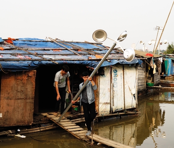Lắp đặt tua-bin gió gắn trên thuyền của người dân xóm chài bãi giữa sông Hồng. Ảnh: LÊ CƯỜNG. |